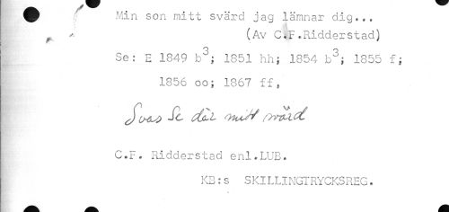 //// f ||JP § Min son mitt svärd jag lämnar dig... //// ^ (Av C.F.Ridderstad) //// Se: E 1849 b3; 1851 hh; 1854 b3; 1855 f; //// 1856 ooj 1867 ff, //// C.F. Ridderstad enl.LUB. //// KB:s S KlLLINGTRYCKS REG. //// * ////