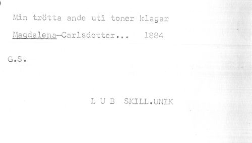 //// Min trötta ande uti toner klagar //// ' ^'TrllwHBBBHBBBf //// Magdalena-Carlsdotter*.• 1884 G.S • //// v ?. //// L U B SKILL.UNIK ////