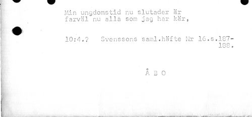 //// Min ungdomstid nu slutader är ] farväl nu alla som jag har kär» //// 10:4,? Svenssons saml.häfte Nr 16.s ,187- //// 188 . //// t //// t ÅBO ////