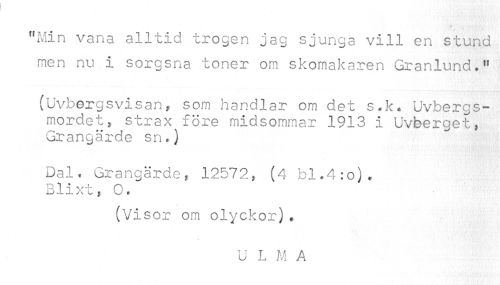 //// "Min vana alltid trogen jag sjunga vill en stund men nu i sorgsna toner om skomakaren Granlund.11 //// (Uvbergsvisan, som handlar om det s.k« Uvbergs-mordet, strax före midsommar 1913 i Uvfeerget, Grangärde sn.) //// Dal. Grangärde, 12572, (4 bl.4:o). Blixt, O. //// (Visor om olyckor). //// U L M A ////