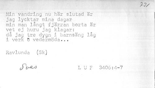 //// //// /Min vandring nu här slutad är jag lycktar mina dagar min man långt fjärran borta är vet ej huru jag klagar: då jag tre dygn i barnsäng låg i verk o vedermöda... //// Ravlunda (Sk) //// JW LUF 3406:4-7 ////
