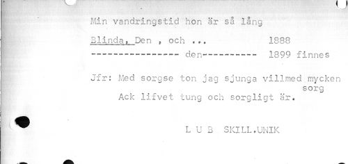 //// f'. * Min vandringstid hon är så lång //// Blinda». Den > och ... 1888 //// ----...—--- den—---—------ 1899 finnes //// //// /Jfr: Med sorgse ton jag sjunga villmed mycken //// sorg //// Ack lifvet tung och sorgligt är. //// L U B SKILL.UNIK ////
