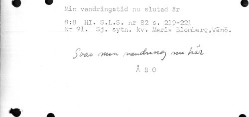 //// Min vandringstid nu slutad är //// 8:8 Hl. S.L.S. nr 82 s. 219-221 //// Nr 91. Sj. sytn. kv. Maria Blomberg*Vänö« //// t //// ÅBO ////