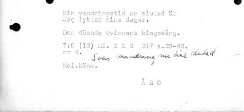 //// Min vandringstid nu slutad är > Jag lyktar mina dagar. //// ^^ Den döende qvinnans klagosång. //// 7:8 (12) Hl. SLS 317 s.38-40. //// Mel.hänv. //// I ÅBO ////
