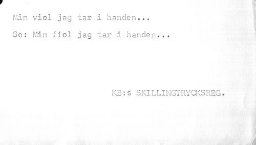 //// i //// Min viol jag tar i handen* //// '"a //// Se: Min fiol jag tar i handen... //// KB:s SKILLINGTRYCKSREG. //// > //// J ////