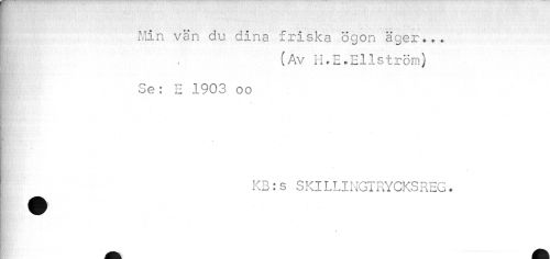 //// - ' //// I Min vän du dina friska ögon äger... //// I . (Av H.E.Ellström) //// Se: E 1903 oo //// f t|.;| 'v.';, //// s //// t //// ; KB:s SKILLINGTRYCKSREG. //// AH ' ////