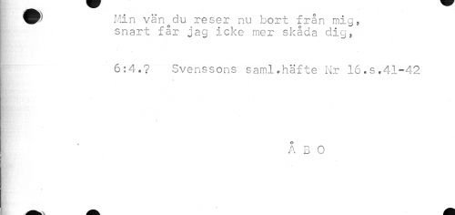 //// il Min vänodu reser nu bort från mig, //// snart får jag Icke mer skåda dig, //// HB //// 6:4.? Svenssons saml.häfte Nr 16.s.41-42 //// [ //// I .. ÅBO //// K ////