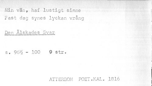 //// Min vän, haf lustigt sinne Fast dag synes lyckan vrång //// Den Älskades Svar //// i //// ; f //// s. 96^ - 100 9 str. //// — //// r- //// ! //// AT T ERBOM POET•KAL. 1816 ////