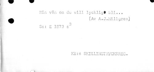 //// Min vän om du vill lyckligt bli... //// (Av A.J.Hillgren) //// | Se: E .1873 s^ //// fltfi ' j //// I KB:s SKILLINGTRYCKSREG. //// t //// I ////