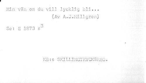 //// Min vän om du vill lycklig bli... //// (Av A.J.Hillgren) //// Se: E 1S73 s3 //// KB:s SKlLLINGTRYCKSREG. ////
