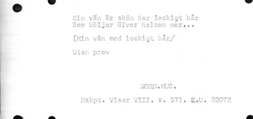 //// Min vän är skön har lockigt hår Som böljar öfver halsen ner..* //// ; (Min vän med lockigt hår //// /I Utan prov //// ¦HK - ¦ //// NORD. MUS. //// Mskpt. Visor VIII. s. 571. H.U. 32072 ////