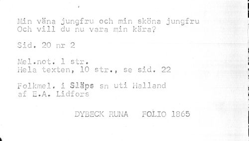 //// Min vana jungfru och min sköna jungfru j //// Och vill du nu vara min kära? //// Sid. 20 nr 2 i //// m ¦ //// C //// I //// C //// Me 1 * n o t. 1 s t r * i //// Hela texten, 10 str., se sid. 22 [ //// § //// Folkmel. i Släps sn uti Halland | //// af E.A* Lidfors j //// r //// . > //// fe //// DYBECK RUNA FOLIO 1865 //// k ////