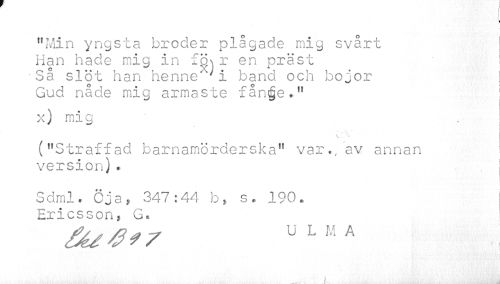 //// "Min yngsta broder plågade mig svårt Han hade mig in f'6\r en präst Så slöt han henne 'i band och bojor Gud nåde mig armaste fånrfje»" //// x) mig //// ("Straffad barnamörderska" var»/av annan version)« //// Sdml. Öja, 347:44 b, s. 190. Ericsson, G, //// ULMA //// k t !U.' V åä: i -tr./ 't.' / Å < . - iitXl ¦ :: to ¦ ////