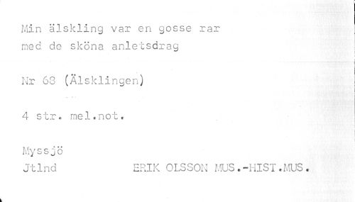 //// Min älskling var en gosse rar med de sköna anletsdrag //// ? > { //// i //// Nr 63 (Älsklingen) //// i i //// « f j 4 str. mel.not. //// I //// j //// Mys s j ö //// Jtlnd ERIK OLSSON MUS.-HIST.MUS. //// k ////