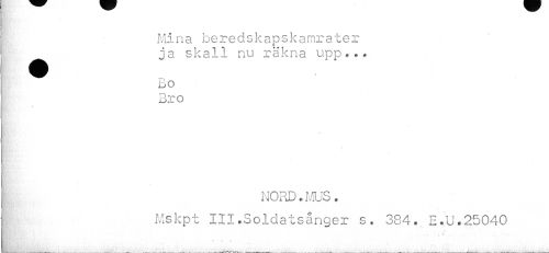 //// Mina beredskapskamrater ja skall nu räkna upp... //// Bo Bro //// t //// wmp:y i ¦ //// NORD.MUS. //// Mskpt III.Soldatsånger s. 384. E.U.25040 //// * * »> ////
