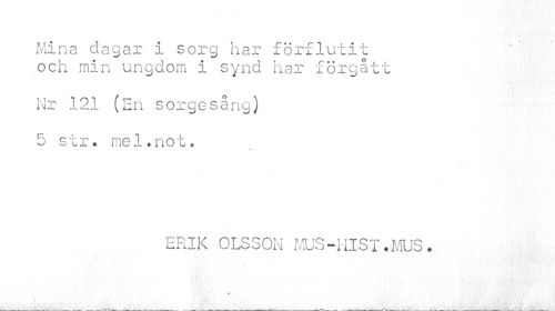 //// Mina dagar i sorg har förflutit och min ungdom i synd har förgått //// Nr 121 (En sorgesång) 5 str. mel.not, //// 4 //// ERIK OLSSON MUS-HlST.MUS. //// * //// I ////
