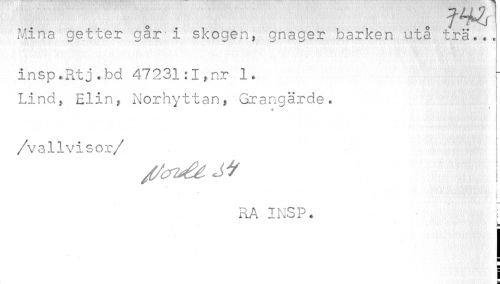 //// 7 //// Mirta getter gar-i skogen, gnager barken utå trä... //// insp.Rtj.bd 47231:I,nr 1. Lind, Elin, Norhyttan, Grangärde. //// /vallvisor //// /t i t i //// RA INSP. ~ //// k ////