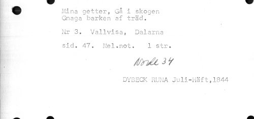 //// Mina getter, Ga i skogen Gnaga barken af träd. //// Nr 3. Vallvisa, Dalarna //// sid. 47 . Me 1. not.. 1 str * //// * //// ' DYBECK RUNA Juli-Häft,1844 ////