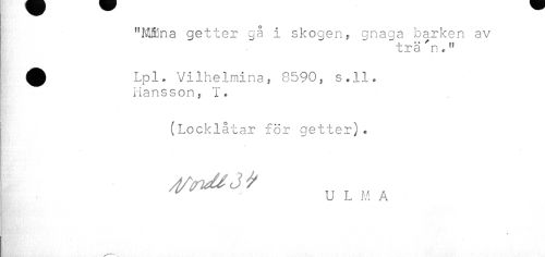 //// "Mffina getter gå i skogen, gnaga barken av //// ~trä'n.ff //// ^ Lpl* Vilhelmina i 8590, s.ll. //// Hansson, T. //// ¦ //// (Locklåtar för getter). //// U L M A ////