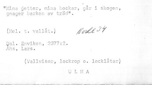 //// "Mina getter, mina bockar, går i skogen, gnager barken av träd". //// (Mel. t. val låt.) 9al* Enviken, 2377:2. //// Ahs, Lars. //// § //// (Vall //// v i s o r * //// lockrop o. locklåtar) U L M A ////