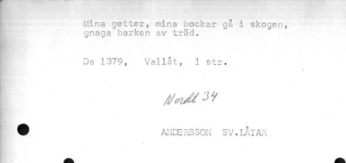 //// " « - //// I- Mina getter, mina bockar gå i skogen, //// I gnaga barken av träd. //// • ¦ : .. -: Da 1379» Vallat, 1 str. //// PS» ^ • //// /t/n/tM //// X 9 ANDERSSON SV.LÅTAR ////