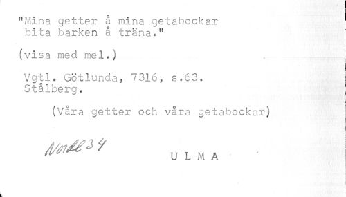 //// "Mina getter å mina getabockar j //// bita barken å träna*" //// (visa med mel.) //// Vgtl. Götlunda, 7316, s.63. Stålberg. //// (våra getter och våra getabockar) //// U L M A //// k ////