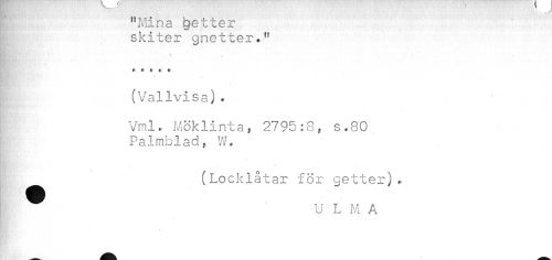 //// "Mina getter //// skiter gnetter." //// p //// * « » i I //// 1 //// t (Vallvisa). //// Vml. Möklinta, 2795:8, s.80 Palmblad, W. //// (Locklåtar för getter). I® U L M A ////