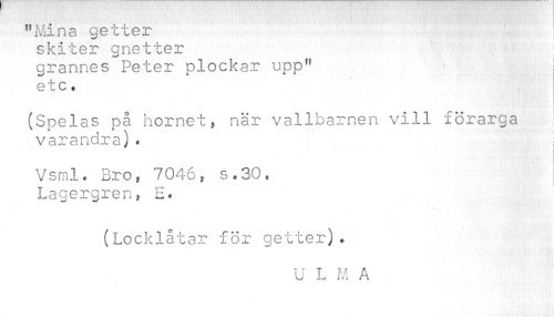 //// "Mina getter //// skiter g ne t ter II ^p?;! //// grannes Peter plockar upp" etc • //// (Spelas på hornet, när vallbarnen vill förarga varandra). I //// Vsml. Bro9 7046, s.30. Lagergren, E« //// (Locklåtar för getter). //// U L M A ////