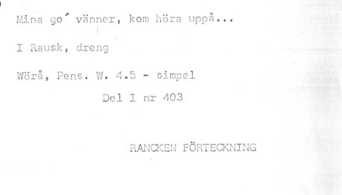 //// Mina go' vänner, kom höra uppå... //// é f //// I Rausk, dreng //// Wörå, Pens. W. 4.5 - simpel //// Del I nr 403 //// RANCKEN FÖRTECKNING ////