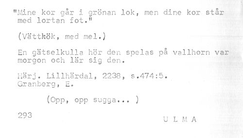 //// "Mine kor går i grönan lok, men dine kor står med lortan fot." //// (Vätthök, med mel.) //// En gätselkulla hör den spelas på vallhorn var morgon och lär sig den. //// Härj. Lillhärdal , 2238, s. 474:5. Granberg, E. //// (Opp, opp sugga... ) //// OQ3 //// U L M A ////