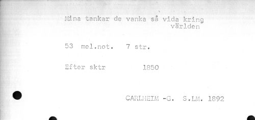 //// Mina tankar de vanka så vida kring //// världen //// ¦ //// 53 mel.not. 7 str. Efter sktr 1850 //// W CARLHEIM -G. S,LM. 1892 //// flt å ////