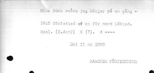 //// Mina öden svåra jag börjar på en gång - //// | 1865 författad af en för mord häktad. //// I Ma a1. (E.A:n?) 6 (7). 4 ---- //// Del II nr 1080 //// *» //// I RANCKEN FÖRTECKNING ////