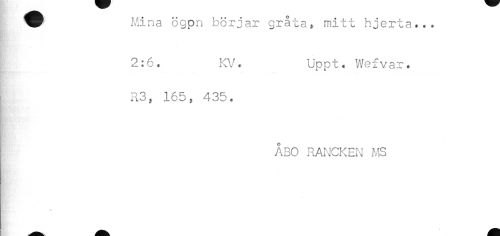 //// I ^r Mina ögpn börjar gråta» mitt hjerta... //// 2:6. KV. Uppt. Wefvar. //// i R3, 165, 435. //// ÅBO RANCKEN MS ////