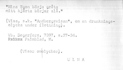 //// "Mina ögon börja gråta mitt hjärta börjar slå." //// (Visa, s.k. "Andbergsvisan", om en drunknings- //// .olycka under flottning)• //// Vb. Degerforsf 7397, s.27-34. RaPalmblad, W# //// (Visor omblyckor). //// u L m A ////