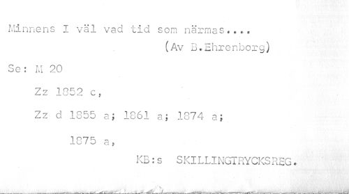 //// Minnens I väl vad tid son närmas..,, //// (Av B.Ehrenborg) //// Se: M 20 //// Zz 1052 c, //// Zz d 1855 a; 1861 a; 1874 a; //// 1875 a, //// KB:s SKILLINGTRYCKSREG. ////