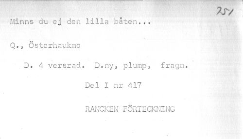 //// 7JV //// Minns du ej den lilla båten..• //// Q,Österhaukmo //// D# 4 versrad.. D.ny, plump, fragm. //// Del I nr 417 //// RANCKEN FÖRTECKNING ////