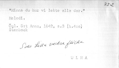 //// "Minns du hur vi lekte alla dar.." Melodi. //// Ögl. S:t Anna, 1642, s.3 (h.4:o) Stenbock //// ¦ ¦ ¦ f //// U L M A //// ! ////