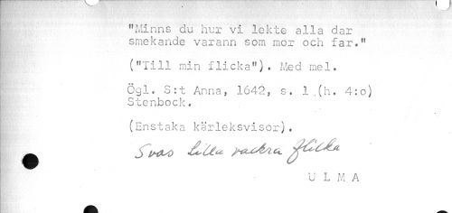 //// "Minns du hur vi lekte alla dar | smekande varann som mor och far." //// ("Till min flicka"). Med mel. //// HE'1' ¦ //// Ggl. S:t Anna, 1642, s. l.(h. 4: o) , Stenbock. //// (Enstaka kärleksvisor). //// jwuSZ/LCx. yrt^c^-M. //// U L M A ////
