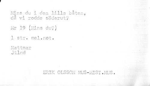 //// I //// Mins du i den lilla båten, då vi rodde söderut? //// Nr 19 (Mins du?) //// 1 - str? mel.not« //// Mattmar Jtlnd //// ERIK OLSSON MUS~HIST*MUS. ////