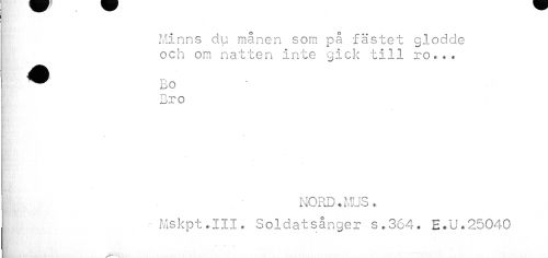 //// Minns du månen som på fästet glodde och om natten inte gick till ro... //// I Bro //// I //// i //// NORD.MUS, //// f //// • Mskpt.III. Soldatsånger s.364. E.U.25040 ////