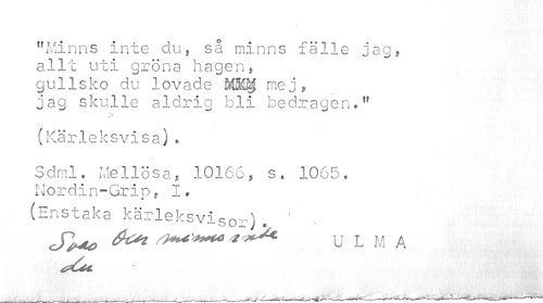 //// "Minns inte du, så minns fälle jag, allt uti gröna hagen, gullsko du lovade MX6J mej, jag skulle aldrig bli bedragen." //// r* //// (Kärleksvisa). //// Sdml. Mellösa, 10166, s, 1065. Nordin-Grip, I. //// (Enstaka kärleksvisor). v //// J]^ * *** U L M A ////