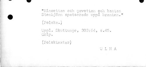 //// 1 //// "Minoettan och gavottan och kantan //// • w o //// •Stenbjörn spatserade uppa branten." (Polska.) //// Uppl. Skuttunge, 303:64, s.45. Grip. //// (Pol sktexter) //// U L M A ////