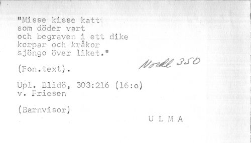//// "Misse kisse katt' som döder vart och begraven i ett dike korpar och kråkor sjöngo över liket*" //// (Fon.text) . //// Upljr Blidö% 303:216 (16:o) i //// v. Friesen //// (Barnvisor) //// U L M A //// i ////