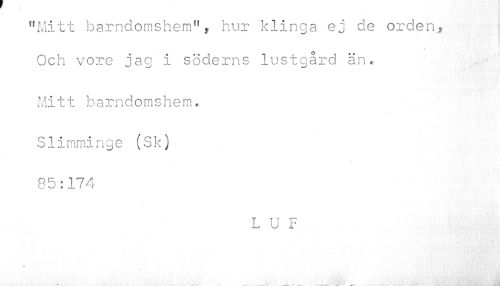 //// "Mitt barndomshem", hur klinga ej de orden.j Och vore jag i söderns lustgård än.- //// Mitt barndomshem... Slimminge (Sk) 85:174 //// L U F //// -«•. u . . ... ' - h... vi n ili .»• i ////