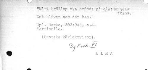 //// "Mitt bröllop ska stånda på glasbergets //// skans• //// Det bliver som det kan." //// Upl* Harbo, 303:946, s.4* Martinelie. //// (Enstaka kärleksvisor)* //// d^UA f] //// Ak ^^ ////