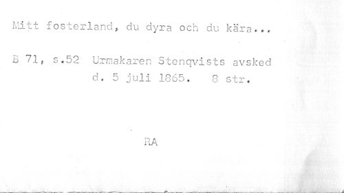 //// Mitt fosterland» du dyra och du kära... //// B 7.1, s .52 Urmakaren'Stenqvists avsked //// d * 5 juli 1865, 8 str. //// \ //// * //// RA ////