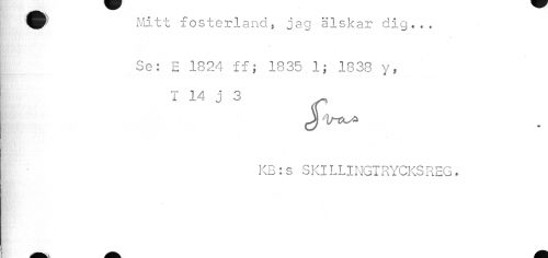 //// W^ Mitt fosterland, jag älskar dig... //// | Se: E 1824 ff; 1835 1; 1838 y, //// T 14 j 3 //// KB:s SKILLINGTRYCKS REG. ////