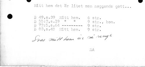 //// Mitt hem det är litet men naggande gott..., //// # B 49,s.39 Mitt hem. 6 str. //// B 55:2,s.19 " " 9 str., kom. //// I B 72:5,s.64 ----9 str. //// j B 83,s»48 Mitt hem. 9 str. //// |....RA ////