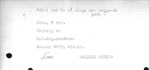 //// "Mitt hem är så. ringa men naggande //// • god t - //// Visa, 9 str. Vinberg1 sn Ref.Aug.Bondeson. Acc.nr 3492, sid.16. //// ^ 9 cffrtä VARBERG MUSEUM ////
