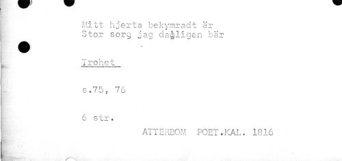 //// i //// Mitt hjerta bekymradt är J Stor sorg jag dagligen bär //// Trohet //// s.75, 76 //// 6 str. //// ATTERBOM POET.KAL. 1816 //// ¦ //// I //// v ' XX. ' • • ////